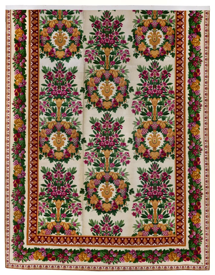 La première partie de l’exposition évoque le contexte historique et économique de cette commande avec des échantillons d’origine et des documents d’archives illustrant l’implication des différents acteurs. Les progrès du domaine textile sont aussi évoqués grâce à la présentation d’une machine à tisser à la mécanique Jacquard et de techniques d’investigation dans le domaine de la chimie et de la teinture.