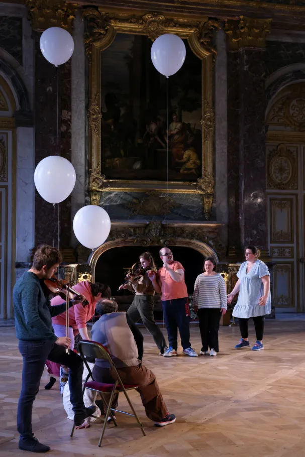 Cette chorégraphie est le résultat d’une semaine entière de rencontre et de partage. Une visite guidée privilégiée dans les Grands Appartements a favorisé l’appropriation des lieux pour les futurs danseurs. Le mouvement des ballons a encadré les différents tableaux chorégraphiques.