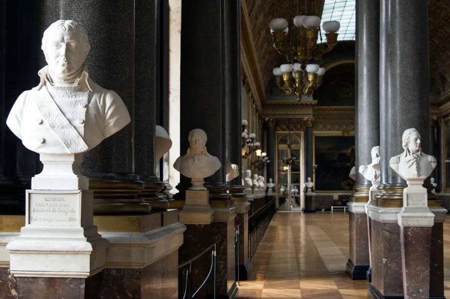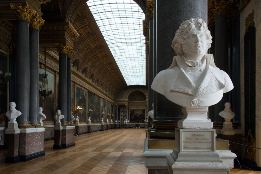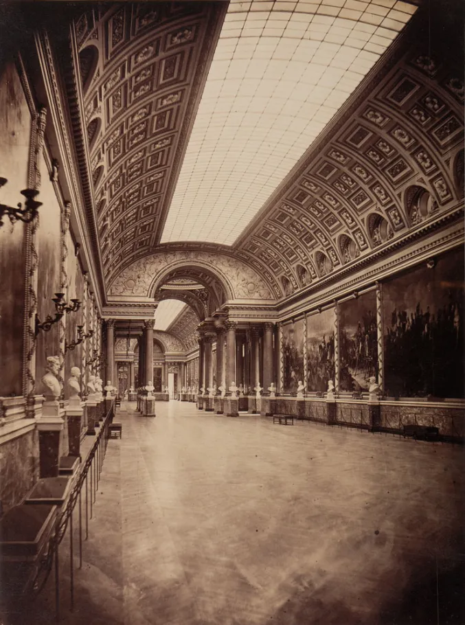 Tous les autres ont été réalisés pour la galerie entre 1834 et 1845 par les peintres d’histoire du moment, Alaux, Bouchot, Couder, Delacroix, Devéria, Féron, Fragonard fils, Franque, Heim, Larivière, Mauzaisse, Picot, les frères Scheffer, Schnetz, Schopin, Steuben et Vernet. L’architecture de la galerie, élaborée par Frédéric Nepveu, sans doute avec les conseils de Pierre-Léonard Fontaine, évoque les projets de celui-ci pour la Grande galerie du Louvre sous le Consulat et l’Empire. Elle constitue un espace solennel, rythmé par des avant-corps de colonnes, éclairé par des verrières à la voûte et richement décoré de marbres et de stucs peints et dorés. La galerie est aussi conçue comme un panthéon des gloires nationales puisqu’elle présente une série de quatre-vingt bustes d’officiers morts au combat ainsi que des tables de bronze portant les noms des princes, connétables, maréchaux et amiraux eux aussi tués ou blessés mortellement pour la France.