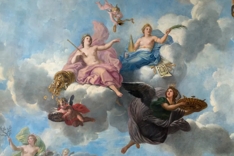 Conçu pour être la chambre d’apparat du souverain, le salon d’Apollon fut finalement utilisé comme salle du trône à partir de 1682. Le plafond est consacré au dieu du soleil, des arts et de la paix. Le symbole solaire, choisi très tôt par Louis XIV, est représenté par Apollon s’élançant sur son char, entouré par des figures allégoriques. Les voussures illustrent la magnificence et la magnanimité du roi, au travers d’exemples tirés de l’Antiquité : Vespasien faisant bâtir le Colisée, Auguste édifiant le port de Misène, Porus devant Alexandre et Coriolan supplié par sa mère et son épouse d’épargner Rome.