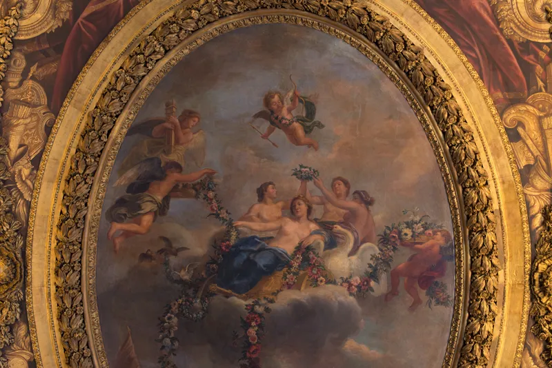 De toute l’enfilade, le salon de Vénus présente le décor le plus baroque. C’est le seul endroit où Le Brun a fait dialoguer architectures, sculptures et peintures, tantôt réelles et tantôt feintes : les pilastres et colonnes de marbre sont repris dans les perspectives peintes par Jacques Rousseau, et deux statues en trompe-l’œil du côté des fenêtres répondent à la figure de Louis XIV par Jean Warin.