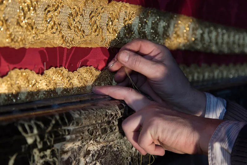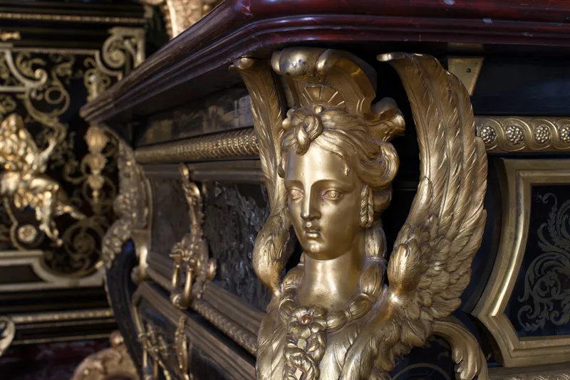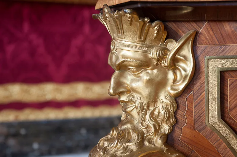 Jusqu’en 1689, une estrade sous un dais accueillait le célèbre trône d’argent de Louis XIV (en réalité un immense fauteuil en bois haut de deux mètres soixante, recouvert de plaques et de sculptures d’argent). Ce meuble extraordinaire envoyé à la fonte fut remplacé par une succession de fauteuils dorés, dont le style évolua au cours du temps.