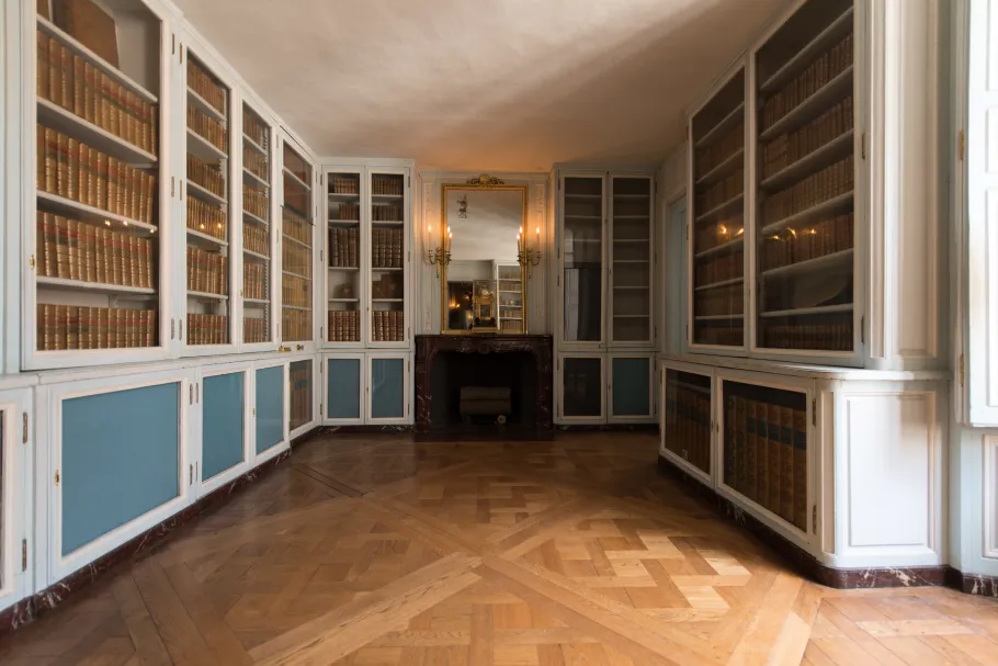 Marie-Antoinette eut une bibliothèque importante qui fut transférée à Paris à la Révolution et se trouve aujourd’hui en grande partie conservée à la Bibliothèque nationale de France. Cette pièce, restaurée entre 2017 et 2020 grâce à un mécénat de la Société des Amis de Versailles, fut aménagée pour la reine entre 1779 et 1781 par l'architecte Richard Mique. De hautes armoires vitrées règnent tout autour ; à l’intérieur de celles-ci, un système de crémaillères ingénieux permet un réglage aisé de la hauteur des étagères.