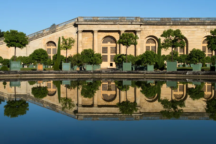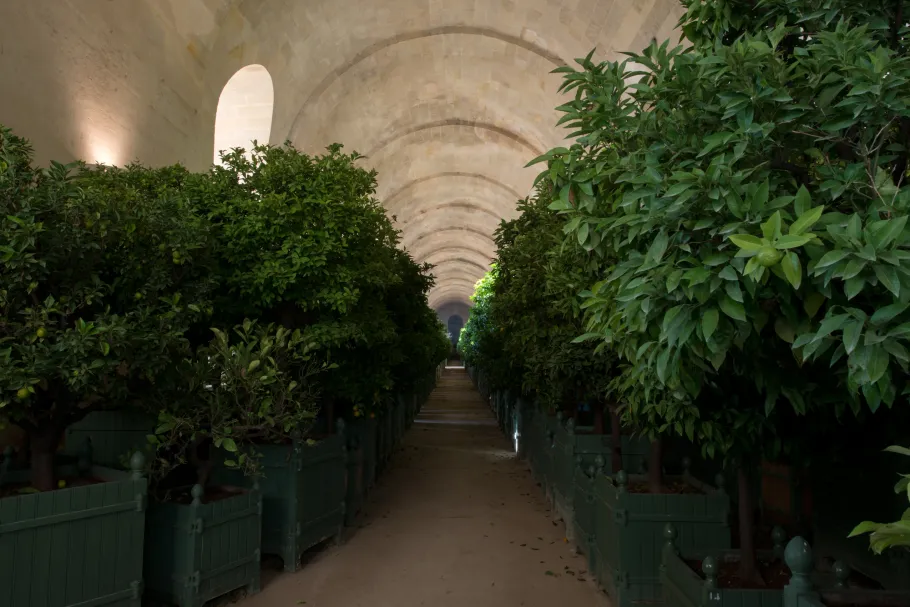 Le château de Versailles est doté d’une orangerie dès 1663, bâtie par Louis Le Vau. L’emplacement est excellent : orientée plein sud, elle est protégée du froid des vents dominants par sa position sous le parterre du Midi. Vingt ans plus tard, Jules Hardouin-Mansart double la longueur de cette première orangerie, ainsi que sa largeur, pour en faire un immense édifice. La galerie centrale est longue de plus de 150 mètres et sa voûte culmine à 13 mètres de haut. Deux galeries en retour s’achèvent sous les escaliers monumentaux des Cent-Marches qui jouent le rôle de contreforts à l’ensemble. Les murs, de 4 à 5 mètres d’épaisseur, les doubles vitrages des baies et l’exposition au Midi permettent de maintenir l’hiver une température qui ne descend pas au-dessous de 5° C.