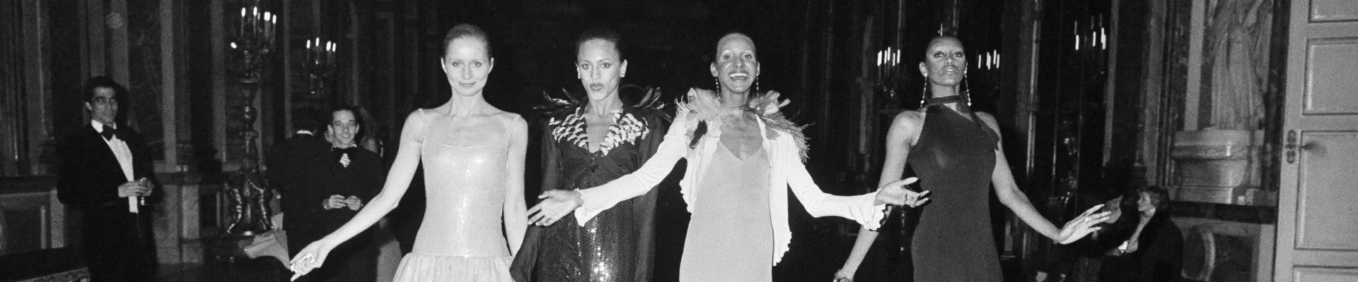 Quatre mannequins américains posent dans la galerie des Glaces, le soir du 28 novembre 1973