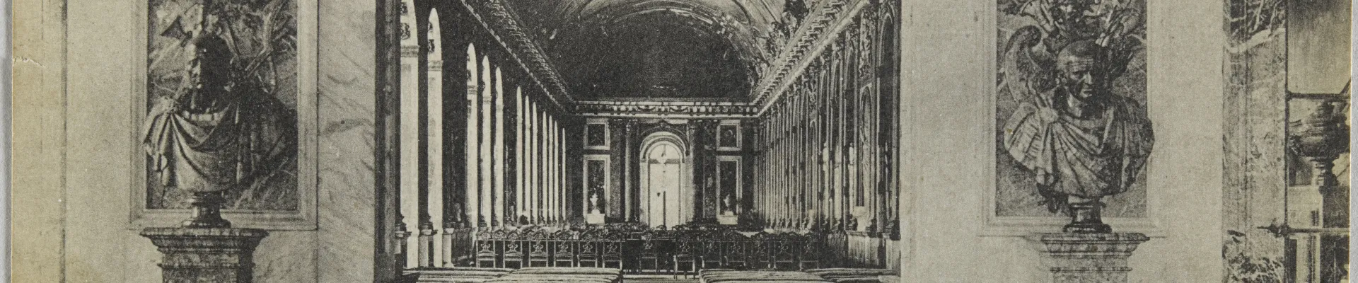 Près d’un demi-siècle après la proclamation de l’Empire allemand, Georges Clemenceau savoure sa revanche : le 28 juin 1919, l’Allemagne, vaincue, signe le traité de paix dans la galerie des Glaces, c’est-à-dire à l’endroit même où son empire avait été proclamé. La Première Guerre mondiale est finie. Un bureau Louis XV a été dressé au centre sous le tableau emblématique de Louis XIVLe roi gouverne par lui-même. La séance dure cinquante minutes. Aucun décorum, aucune musique pour célébrer ce moment solennel. 27 délégations représentant 32 puissances sont présentes. Sont assis à la table, les quatre représentants des principales nations alliées : Clémenceau pour la France, Wilson pour les États-Unis, Lloyd George pour la Grande-Bretagne, Orlando pour l’Italie. Müller, ministre des Affaires étrangères et le docteur Bell composent la délégation allemande.