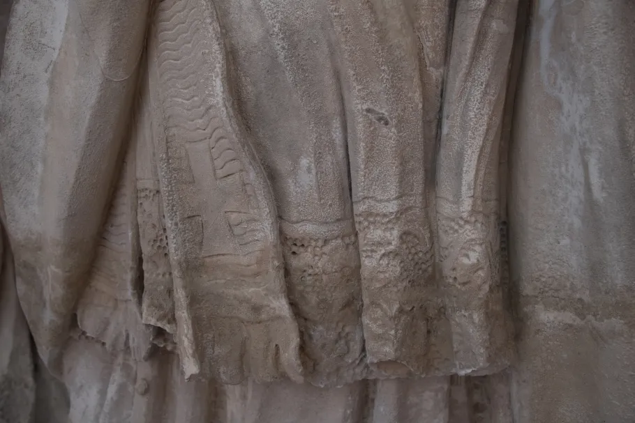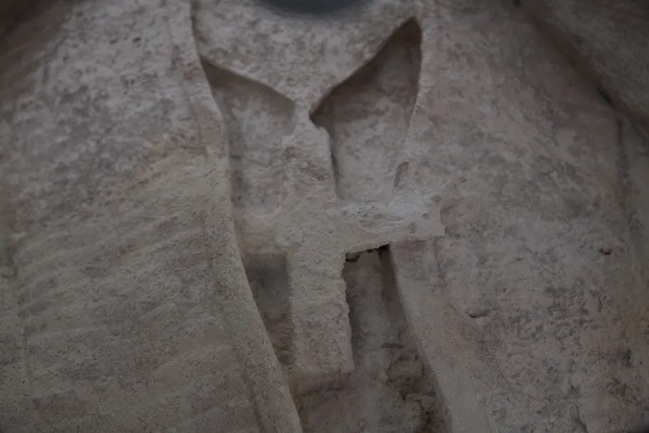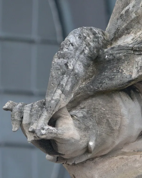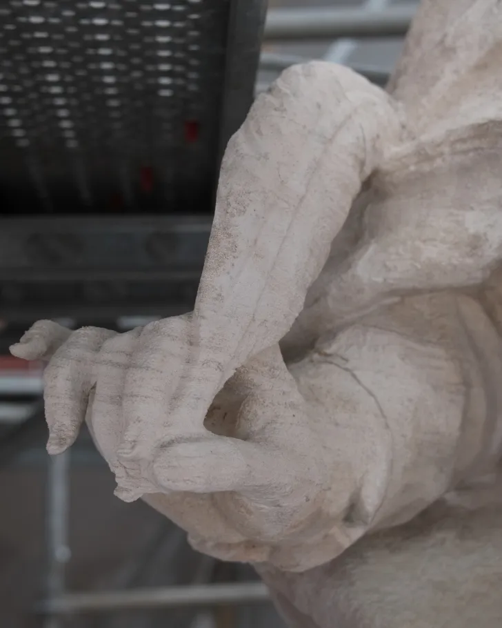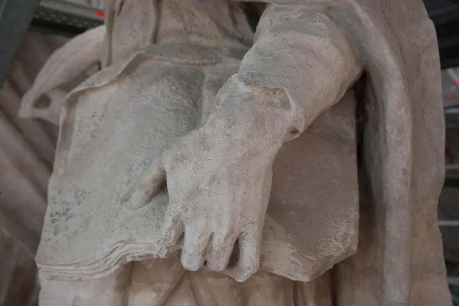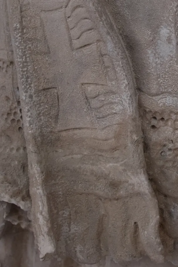 Saint Ambroise est figuré en homme d’âge mûr, les cheveux courts et la barbe longue, vêtu d’une tenue d’évêque comportant mitre, soutane, rochet, chape, étole et croix en sautoir. Un livre ouvert dans la main gauche, il tient une plume de la main droite, en symbole de ses écrits doctrinaux. Né à Trèves vers 339, saint Ambroise est issu d’une famille de la noblesse sénatoriale. Alors qu’il est gouverneur laïc des provinces d’Émilie et de Ligurie, il est élu évêque de Milan par acclamation du peuple en 373. Devenu dès lors un farouche défenseur de l’Église face au pouvoir impérial, il se distingue également par sa contribution au sauvetage de l’héritage culturel de l’Antiquité. Il meurt en 397, laissant une œuvre théologique importante qui lui vaut d’être reconnu comme l’un des quatre Pères de l’Église latine.