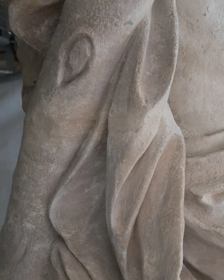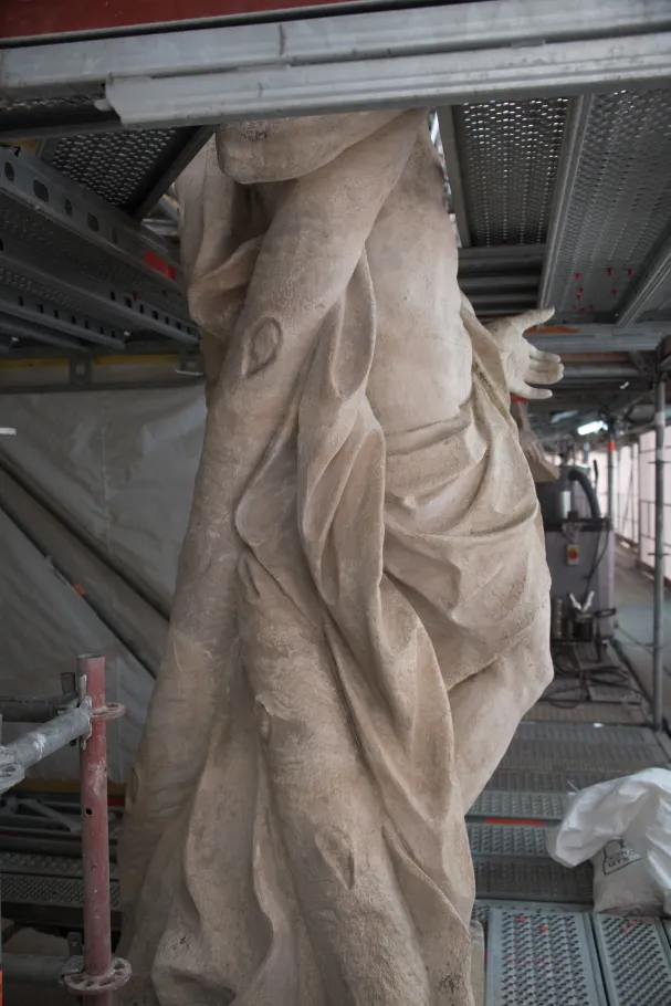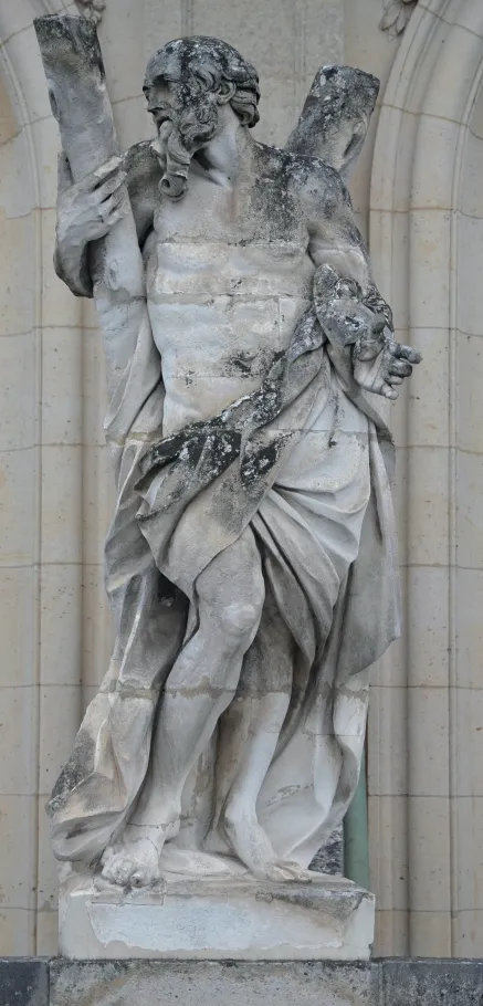 L’apôtre saint André est figuré en homme d’âge mûr, dont le corps nu n’est recouvert que par un drapé au niveau du bassin. Encadré par une longue barbe et des cheveux courts, le visage est tourné vers la croix en X sur laquelle s’appuie le saint. Pêcheur sur le lac de Tibériade, comme son frère cadet saint Pierre, saint André est le premier apôtre à suivre Jésus. La légende dorée de Jacques de Voragine lui prête après la Pentecôte un apostolat légendaire en Asie Mineure, le long des côtes de la Mer Noire et enfin en Grèce, où il fut crucifié sur ordre des autorités romaines. Particulièrement vénéré par l’Église Orthodoxe, il est également le saint patron de l’Écosse.