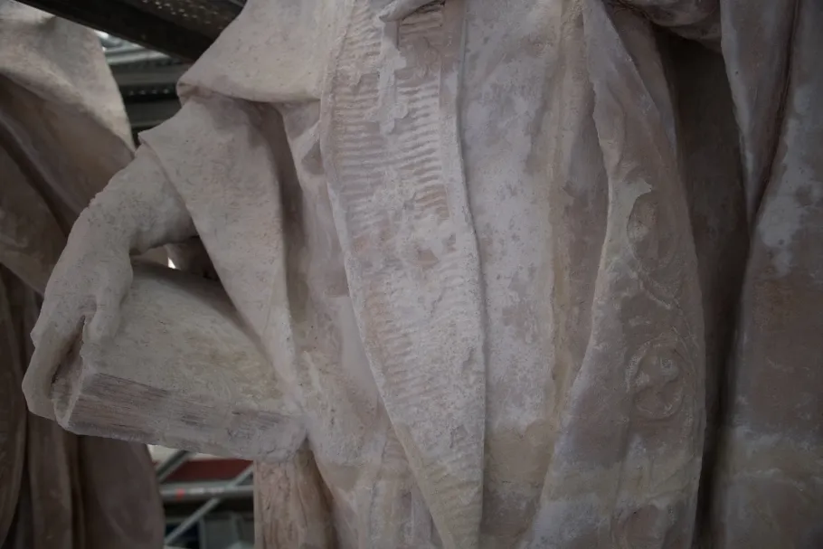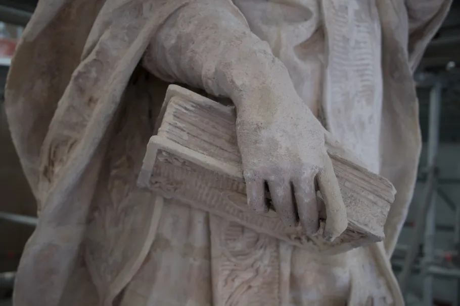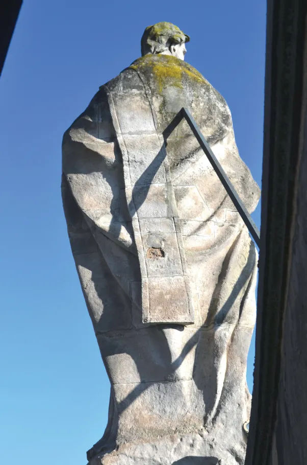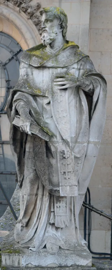 Saint Athanase porte une tenue d’évêque, incluant tunique, chasuble et étole repliée sur l’épaule, à la manière des Églises orientales. Son visage, tourné vers l’Est, est encadré par des cheveux courts et une barbe. Le bras gauche replié sur la poitrine, il tient un livre fermé dans la main droite. Né vers 296 dans une famille chrétienne aisée, il intègre très jeune le clergé égyptien et devient évêque d’Alexandrie en 328. Son opposition constante à l’arianisme, pourtant soutenu par l’empereur Constance II, le contraint à s’exiler à cinq reprises. À sa mort en 373, il laissera une œuvre considérable par son contenu théologique et par les renseignements qu’elle nous fournit sur la crise arienne. Il est reconnu comme l’un des quatre Pères de l’Église grecque.