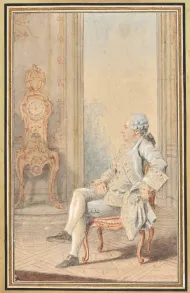 Sur cette belle feuille aquarellée, Carmontelle représente Jean-Benjamin de La Borde (1734 - 1797), nommé en 1762 valet de chambre du roi et gouverneur du Louvre. Il fait face à la célèbre pendule astronomique conçue par Claude-Siméon Passemant dès 1743 et installée dans le petit appartement du roi en 1754. Sur ce dessin, elle est représentée complète, avec son boitier en bronze doré, chef-d’œuvre rocaille de Jacques Caffieri, sur son piédestal de marbre. Carmontelle met ici en scène de manière indirecte l’intimité de La Borde avec le roi, tandis que la clef qu’il tient dans sa main gauche, négligemment mais ostensiblement, évoque sans doute sa fonction de gouverneur du Louvre. Carmontelle et La Borde fréquentaient les mêmes salons parisiens, en particulier celui de la Guimard, célèbre danseuse et commédienne dont La Borde était l’amant et pour laquelle Carmontelle composait des saynètes. Le modèle et l’artiste qui le représente avaient d’ailleurs créé ensemble de petites pièces de théâtre.