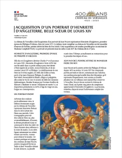 Fille du roi d'Angleterre détrôné Charles Ier et d'une sœur de Louis XIII , Henriette d'Angleterre (1644-1670) fuit son île natale dans sa petite enfance pour être élevée à Paris auprès de sa tante, Anne d'Autriche, et de ses cousins Louis XIV et Philippe. Le rétablissement de son frère sur le trône anglais, en 1660, fait d'elle un beau parti et lui vaut d'épouser Philippe, le cadet du Roi-Soleil. Personnalité brillante, allègre et polyglotte, elle anime la vie de cour et assume de délicates missions diplomatiques. Rendue fameuse par l'oraison funèbre de Bossuet (« Madame se meurt ! Madame est morte ! »), sa disparition prématurée en 1670, à l'âge de vingt-six ans, frappe ses contemporains.