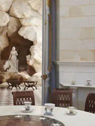 La présence de têtes de béliers sur les pieds des fauteuils et des tabourets rappelle également la fonction du lieu, un temple dédié à la délectation des produits laitiers. Ce mobilier, unique par son luxe et son raffinement, appartient à un décor complet, résonnant avec les sculptures pastorales de Pierre Julien et le service en porcelaine de Sèvres commandé à Jean-Jacques Lagrenée.