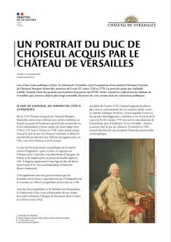 Le tableau, commandé du vivant de Choiseul, fut achevé l’année suivant son décès, en 1786, comme l’atteste la signature de l’artiste sur la version du portrait conservé à Waddesdon Manor, en Angleterre. En 1785, Adélaïde Labille-Guiard, reçue deux ans auparavant à l’Académie royale de peinture et de sculpture, exposait pour la deuxième fois des œuvres au Salon du Louvre. Elle y présenta notamment son célèbre Autoportrait avec deux élèves, aujourd’hui conservé au Metropolitan Museum of Art de New-York. Cette reconnaissance de ses contemporains lui attira le choix du duc de Choiseul pour la réalisation de sa propre effigie. Adélaïde Labille-Guiard fut quelques années plus tard invitée à exécuter les effigies de Mesdames, filles de Louis XV.
