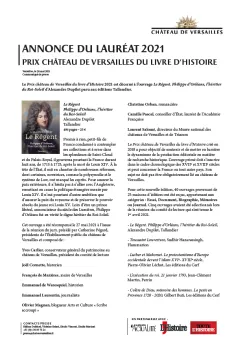Le Prix château de Versailles du livre d’Histoire 2021 est décerné à l’ouvrage Le Régent. Philippe d’Orléans, l’héritier du Roi-Soleil d’Alexandre Dupilet paru aux éditions Tallandier.