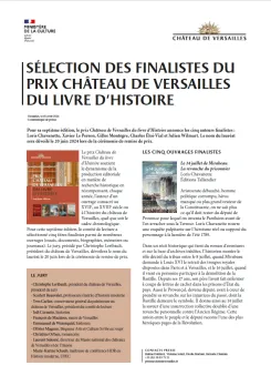 Le prix Château de Versailles du livre d’Histoire soutient le dynamisme de la production éditoriale en matière de recherche historique en récompensant, chaque année, l’auteur d’un ouvrage consacré au XVIIe, au XVIIIe siècle ou à l’histoire du château de Versailles, quel que soit le cadre chronologique. Pour cette septième édition, le comité de lecture a sélectionné cinq titres parmi de nombreux ouvrages (essais, documents, biographies, mémoires ou journaux). Le jury, présidé par Christophe Leribault, président du château de Versailles, dévoilera le nom du lauréat le 20 juin 2024 lors de la cérémonie de remise de prix.