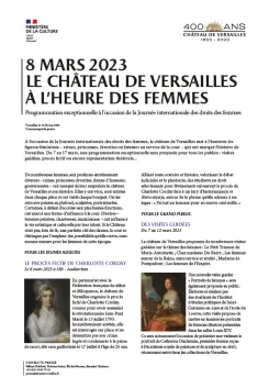 Le château de Versailles proposera de nombreuses visites guidées sur le thème des femmes : Le Petit Trianon de Marie-Antoinette ; Chez madame Du Barry ; Les femmes autour de la Reine, entre service et amitié ; Madame de Pompadour ; Les femmes de l’Empire.