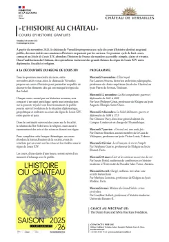 Tous les premiers mercredis du mois, entre novembre 2025 et mai 2026, le château de Versailles propose un cours d'histoire pour permettre au public de découvrir les éléments clés qui ont marqué le règne du Roi-Soleil.