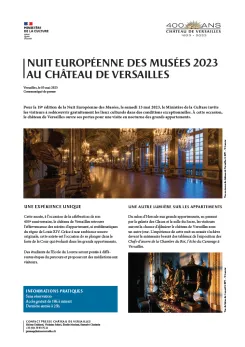 Cette année, à l’occasion de la célébration de son 400e anniversaire, le château de Versailles retrouve l’effervescence des soirées d’appartement, si emblématiques du règne de Louis XIV. Grâce à une ambiance sonore originale, cette soirée est l'occasion de se plonger dans le faste de la Cour qui évoluait dans les grands appartements.