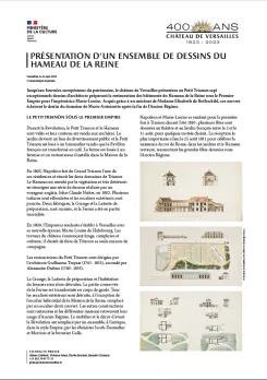 Ces sept dessins de grandes dimensions récemment acquis témoignent des restaurations prévues pour les maisons du Hameau, la ferme et l'Orangerie du Petit Trianon à l'époque du Premier Empire.