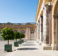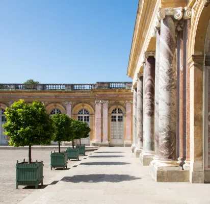 Le marbre règne en maître au Grand Trianon dont l'architecture singulière, voulue par Louis XIV, se caractérise par l’emploi sur les façades et le péristyle de plusieurs marbres issus des carrières : les pilastres en marbre rouge du Languedoc, les colonnes en marbre vert de Campan côté cour d’honneur et en marbre rouge du Languedoc côté jardin, les bases et les chapiteaux ioniques en marbre blanc de Carrare.