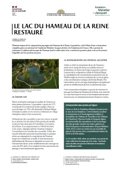Initiée en 2020, la restauration du lac du Hameau a porté sur le curage des boues accumulées dans ses profondeurs, la reprise des berges maçonnées selon les contours de la composition initiale de Richard Mique, la consolidation des enrochements au pied de la tour de Marlborough ou encore la restitution du corroi de glaise et des enrochements rustiques du bief du Moulin. Des interventions sur les ouvrages hydrauliques ont également permis le rétablissement du bon écoulement des eaux.