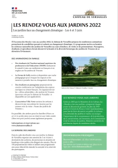 Dans le cadre des Rendez-vous aux jardins, le château de Versailles organise une semaine du 2 au 14 juin à destination des scolaires, des personnes en situation de handicap et des publics dits éloignés des musées. Plus de 150 propositions de visites et ateliers sont programmés avec pour objectif de stimuler la curiosité et la créativité des participants.