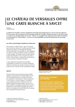Deux ans après la première carte blanche avec le compositeur Thylacine, le château de Versailles poursuit cette initiative avec Saycet. L'occasion pour Versailles de continuer à inspirer les artistes contemporains et d'offrir au public une nouvelle manière de découvrir le Château.