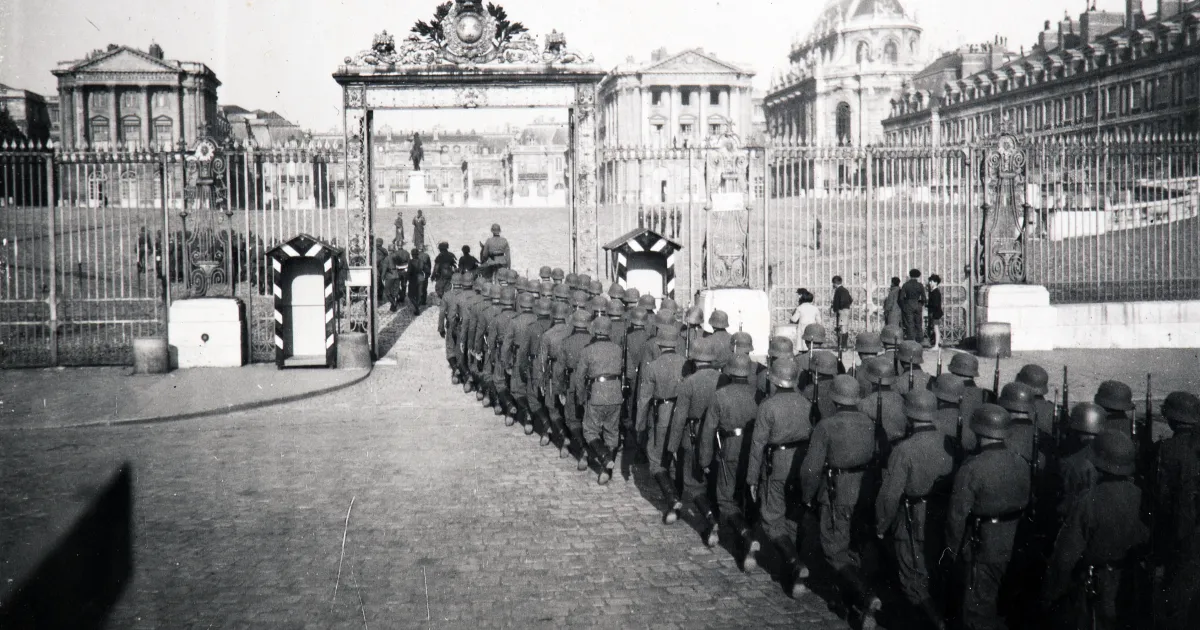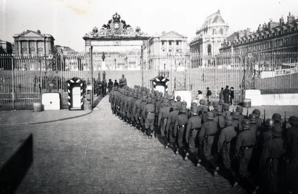 Dans la matinée du 14 juin 1940, les Allemands entrent à Versailles et prennent possession des lieux. Le drapeau nazi flotte dès le lendemain sur les toits du Château. Dans les semaines qui suivent, de très nombreux soldats et officiels allemands investissent le palais, visitent les lieux et causent quelques dégradations. Versailles est bel et bien tombé aux mains du IIIe Reich et l’avenir du Château reste très incertain.