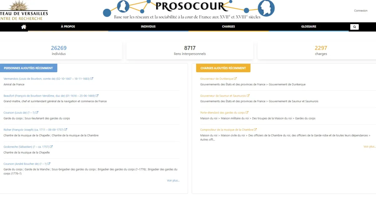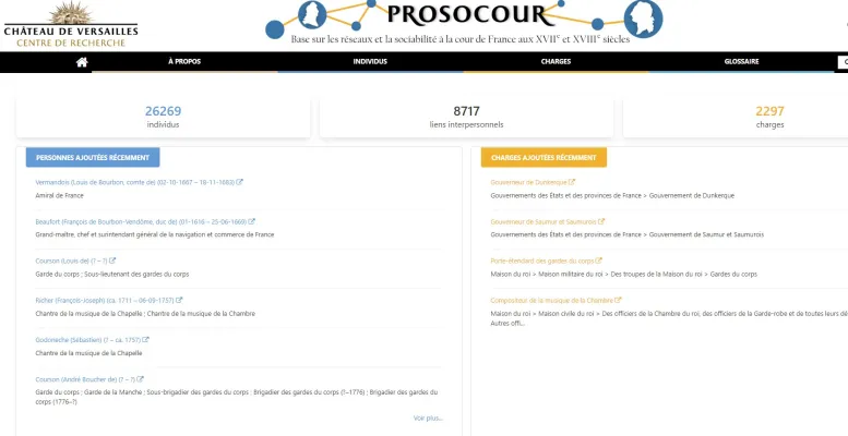 La base Prosocour a pour but de mieux connaitre les personnes qui occupaient des charges à la cour de France, afin d'étudier les réseaux de sociabilité qui s'y tissaient entre 1661 et 1792.