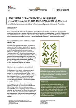 Souhaitant mettre en lumière ce patrimoine végétal exceptionnel, le château de Versailles propose aujourd'hui une collection d'herbiers réalisés à partir de cinq essences d'arbres admirables sélectionnées pour leur esthétique singulière et leur qualité de séchage remarquable : le ginkgo biloba, le platane à feuilles d’érable, le sophora du Japon, le tilleul à petites feuilles et le tulipier de Virginie.