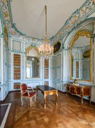 Cette petite pièce, la plus intime de l’appartement, adjacente au grand cabinet, est transformée en bibliothèque en 1755-1756. Elle conserve aujourd’hui encore la majeure partie de ses dispositions d’origine et de son décor dans le goût rocaille. Celui-ci est