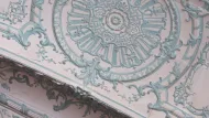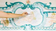 composé de guirlandes de fleurs, de dauphins et illustre la thématique des arts (trophées d’architecture et de peinture, putti dansants).