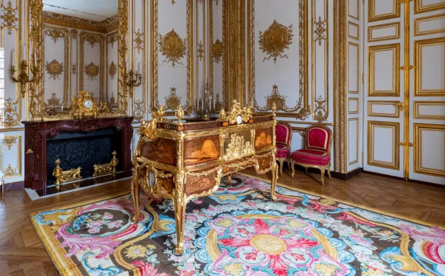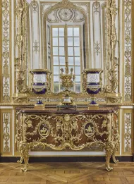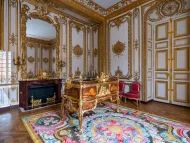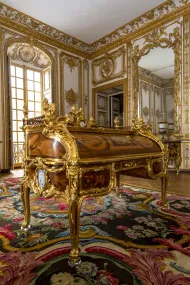 Somptueuse pièce de l’appartement intérieur du Roi, le décor du cabinet d’angle est l’un des plus beaux décors rocaille du Château, véritable témoin d’un moment de perfection de l’art français. Les bordures des glaces et les boiseries, chefs-d’œuvre de Jacques Verberckt, représentent des jeux d’enfants. Les meubles, réunis par Louis XV - que l’on peut toujours admirer dans cette pièce - constituent, par l’élégance de leur forme, la qualité de leur marqueterie et la magnificence de leurs bronzes, le plus bel ensemble qui soit. Ainsi sont rassemblés la commode-médaillier d’Antoine-Robert Gaudreaus livrée en 1739, les encoignures fournies par Gilles Joubert en 1755, et surtout le secrétaire à cylindre réalisé par Jean-François Œben et achevé par Jean-Henri Riesener de 1760 à 1769, sans doute l’un des meubles les plus célèbres au monde.