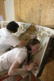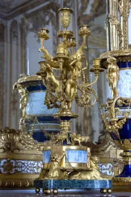 La dorure ancienne a été nettoyée et complétée, et la peinture à la colle en « blanc de Roi » reprise à l’identique selon les techniques du XVIIIe siècle. L’éclairage par des luminaires anciens, girandoles et bras de lumière a été également repensé afin de restituer l’atmosphère intime de la pièce. La restauration a été réalisée dans le respect des techniques traditionnelles par des artisans aux savoir-faire hautement spécialisés : maçonnerie, plâtrerie, électricité, menuiserie d’art, marbrerie, serrurerie et bronzerie d’art, peinture et dorure.