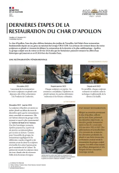 La sculpture d'Apollon est entrée en atelier plomb au début du mois de décembre après que les restaurateurs aient consolidé ses armatures. Elle est l'ultime élément du groupe à être restauré et aussi le plus monumental : 2,7 mètres de haut et 6,5 tonnes. Une fois l'enveloppe restaurée, Apollon poursuivra, à partir de mi-janvier, sa métamorphose par sa mise en dorure. Comme pour l'ensemble du groupe, les restaurateurs appliqueront les différentes couches d’apprêt et de mixtion avant de dorer la sculpture à la feuille d'or selon l’option prise par le ministère de la Culture. Ils patineront ensuite la sculpture dans des tons chauds afin de retrouver l'effet de la bronzure d'origine.