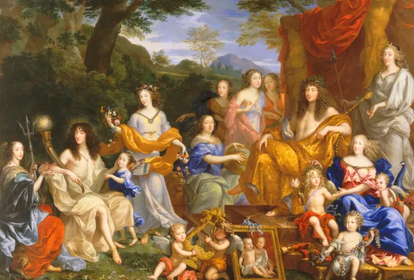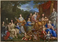 La Famille royale dans l’Olympe a été peint en 1670 par Jean Nocret et présente une iconographie qui nous semble aujourd’hui très versaillaise : le Roi-Soleil, couronné de lauriers, apparaît au centre de la composition sous les traits du dieu Apollon, entouré de son épouse la reine Marie-Thérèse en Junon, de son fils le Grand Dauphin en Amour ou encore de sa cousine, la Grande Mademoiselle, en Diane.