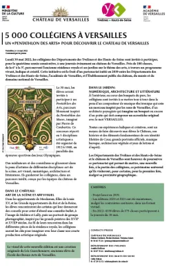 Les Départements des Yvelines et des Hauts-de-Seine et le château de Versailles sont heureux de poursuivre ce partenariat qui permet de mettre, une nouvelle fois, à la portée des collégiens, ce patrimoine universel qu’ils visiteront, pour certains, pour la première fois, malgré sa proximité géographique.