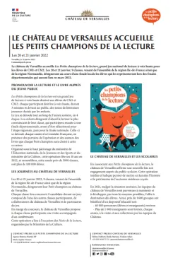 En s'associant aux Petits champions de la lecture, le château de Versailles affirme une nouvelle fois son engagement auprès du public scolaire. Cette opération inédite et ludique permet de mettre en lumière l'histoire et le patrimoine de l'ancienne résidence royale.