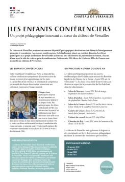 Le château de Versailles mène depuis de nombreuses années une politique d'éducation artistique et culturelle volontaire auprès du public scolaire et étudiant. En 2021, près de 40 000 élèves ou enseignants ont bénéficié d'un dispositif éducatif proposé par le château de Versailles. Parmi ces dispositifs, nombreux sont ceux qui, comme les enfants-conférenciers, permettent aux jeunes d’engager tout au long de l’année des projets de médiation leur donnant ainsi l’opportunité d’explorer les lieux et les collections pour en délivrer leurs perceptions auprès de différents publics : scolaires, étudiants, familles, ou encore grand public.