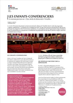 Initié en 2012 par l’Académie de Paris, le dispositif des enfants-conférenciers a pour objectif de renforcer le sentiment de compétence des élèves dans le musée. Les élèves viennent d’abord découvrir le château de Versailles, puis chaque classe participante dispose d’environ sept semaines pour préparer sa visite. Par petits groupes, les jeunes deviennent ainsi médiateurs pour une classe d’un autre niveau et d’un autre établissement scolaire. Par la suite, ils réalisent à leur tour la médiation à la classe suivante.