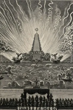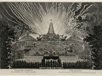Après la conquête de la Franche-Comté, Louis XIV fait donner une série de fêtes à Versailles durant l’été 1674. Parmi les divertissements, le feu d’artifice tiré au-dessus du Grand Canal est une attraction majeure. Il permet d’inaugurer le canal récemment terminé et de montrer la richesse et la puissance du roi. Félibien décrit ce spectacle grandiose en montrant le sens caché à accorder à ce tableau : il insiste avant tout sur les effets de lumière qui symbolisent la gloire du Roi-Soleil tout-puissant en son royaume.