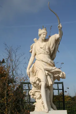Figure centrale de la galerie des Glaces à la fin du XVIIe siècle, cette Diane romaine du Ier siècle, copie de l’Artémis de Léocharès (IVe siècle av. J-C), est, de par sa perfection mais aussi sa rareté, l’icône des collections royales d’antiques. Après avoir suivi l’itinérance de la cour au XVIe siècle et décoré le jardin de la Reine à Fontainebleau, elle est conservée avec les antiques du Louvre. Louis XIV la fait placer dans la Grande Galerie dans une niche de marbre polychrome avec les antiques les plus précieuses de sa collection.