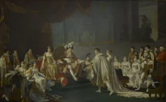 Entouré des membres de sa famille, Napoléon Ier remet à son frère Jérôme le contrat de mariage l’unissant à Catherine de…
