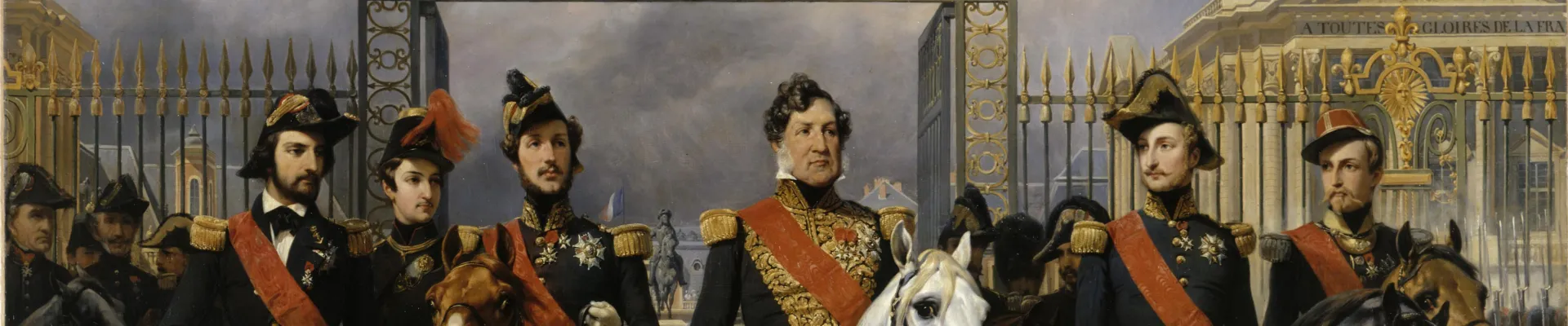 Horace Vernet, Le roi Louis-Philippe entouré de ses cinq fils sortant par la grille d'honneur du château de Versailles, 1846, Château de Versailles